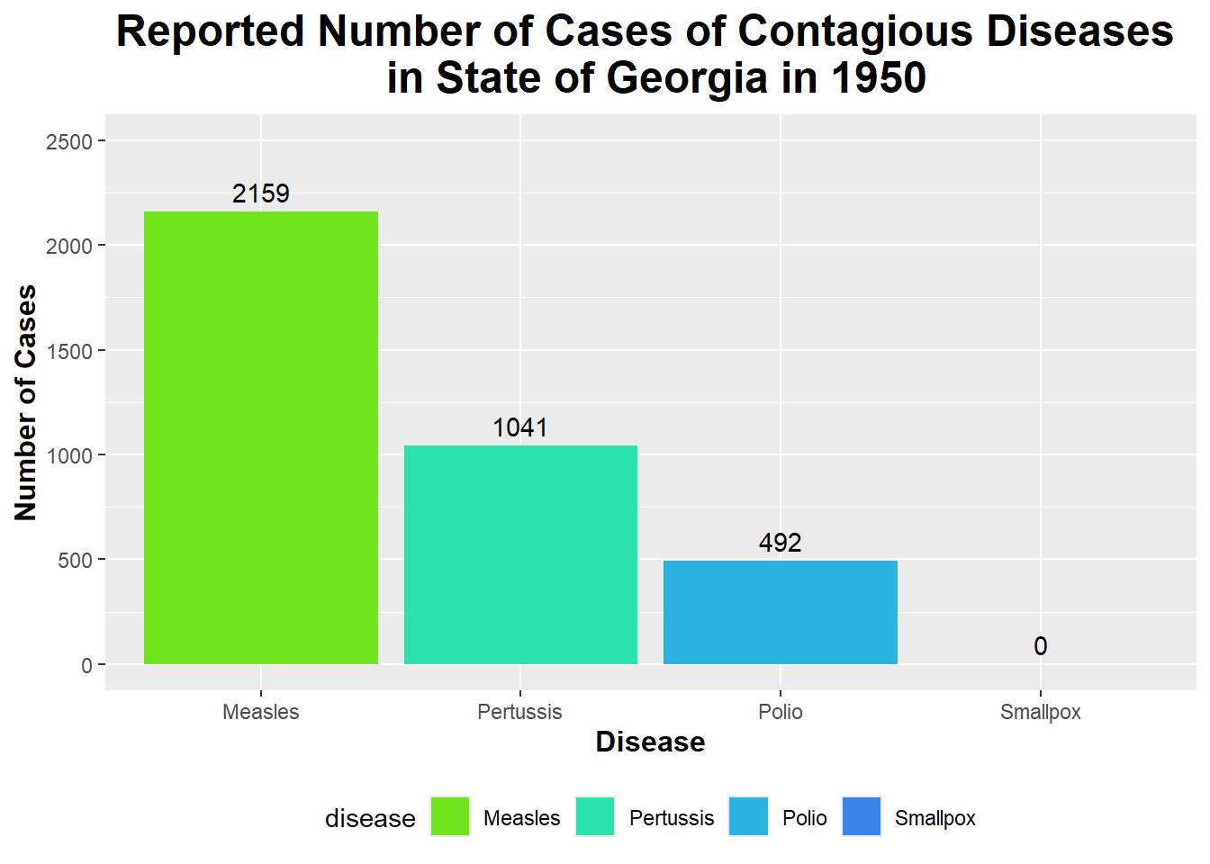 You can see from the bar graph above that the number of Measles cases in GA in 1950 was the highest out of all the diseases shown here (with the number of cases being 2159).