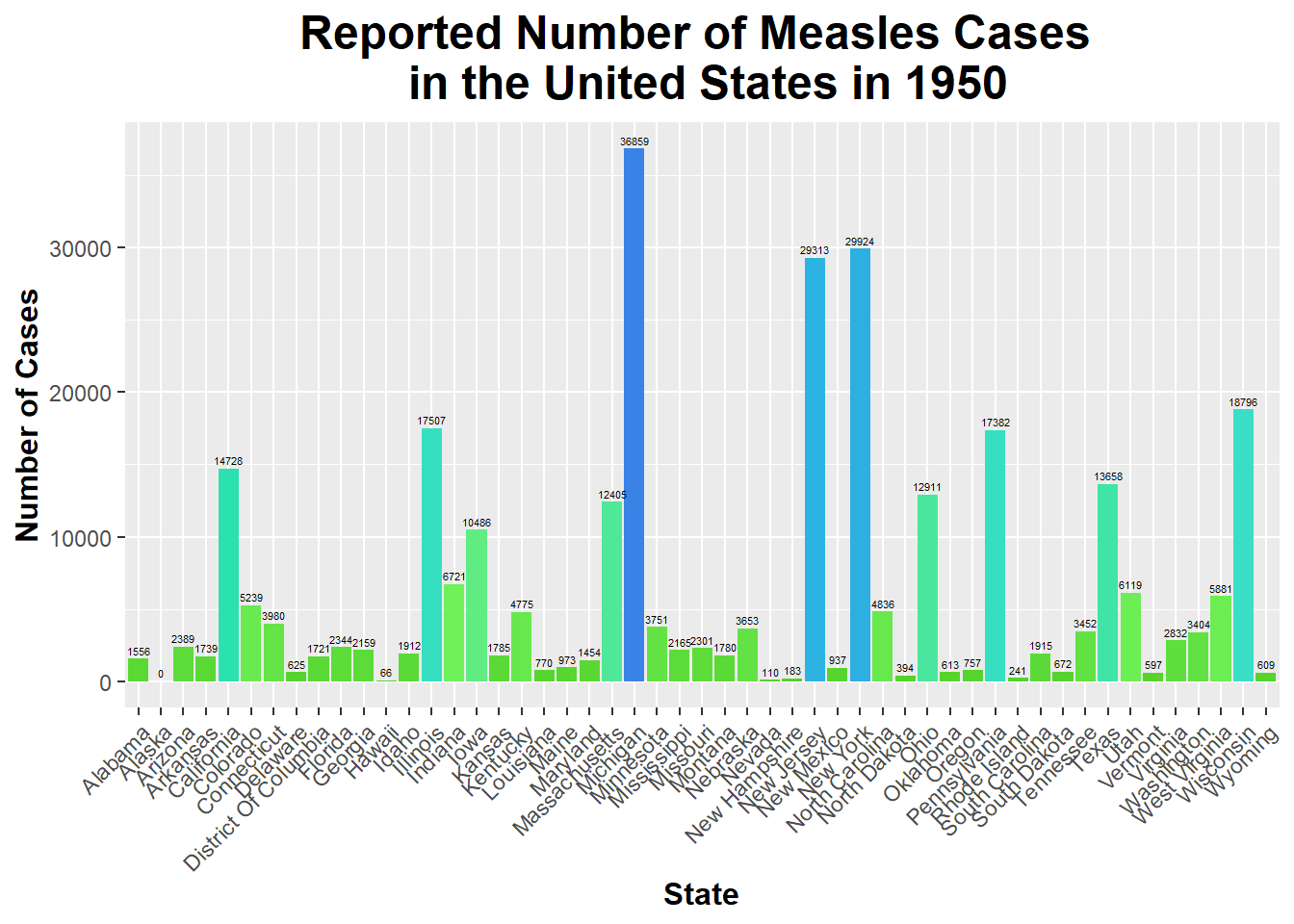 This bar graph shows the number of Measles cases reported in each state in 1950. As you can see, Michigan had the highest number of reported cases of Measles; on the other hand, Alaska had the lowest number of reported cases of Measles.