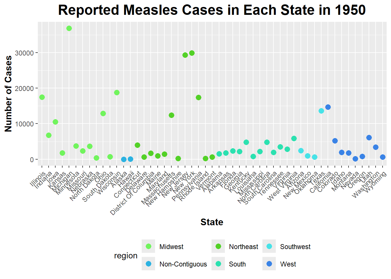As you can see, the Midwest had the highest number of reported Measles cases in 1950 (115836). The Non-Contiguous region had the lowest number of reported Measles cases in 1950 (0) - it is important to note that Alaska and Hawaii are the only states in this region and that Alaska did not report any cases.