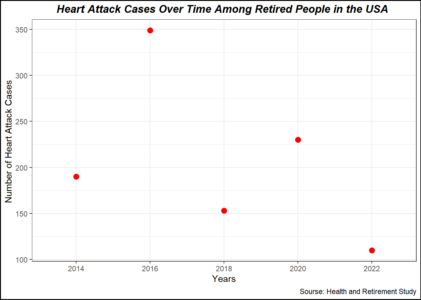 plot2 <-ggplot(table_ha, aes(x = years, y = count)) +geom_line(size =1, color ="blue") +geom_point(size =3, color ="red") +labs(title ="Heart Attack Cases Over Time Among Retired People in the USA ", x ="Years", y ="Number of Heart Attack Cases ",caption="Sourse: Health and Retirement Study") +theme_minimal() +theme_bw()+theme(plot.title =element_text(hjust =0.5, face ="bold.italic")) +# to adjust the title position, size, and colortheme(plot.background =element_rect(color ="black", fill =NA, linewidth =1)) # to create frame of the plot
