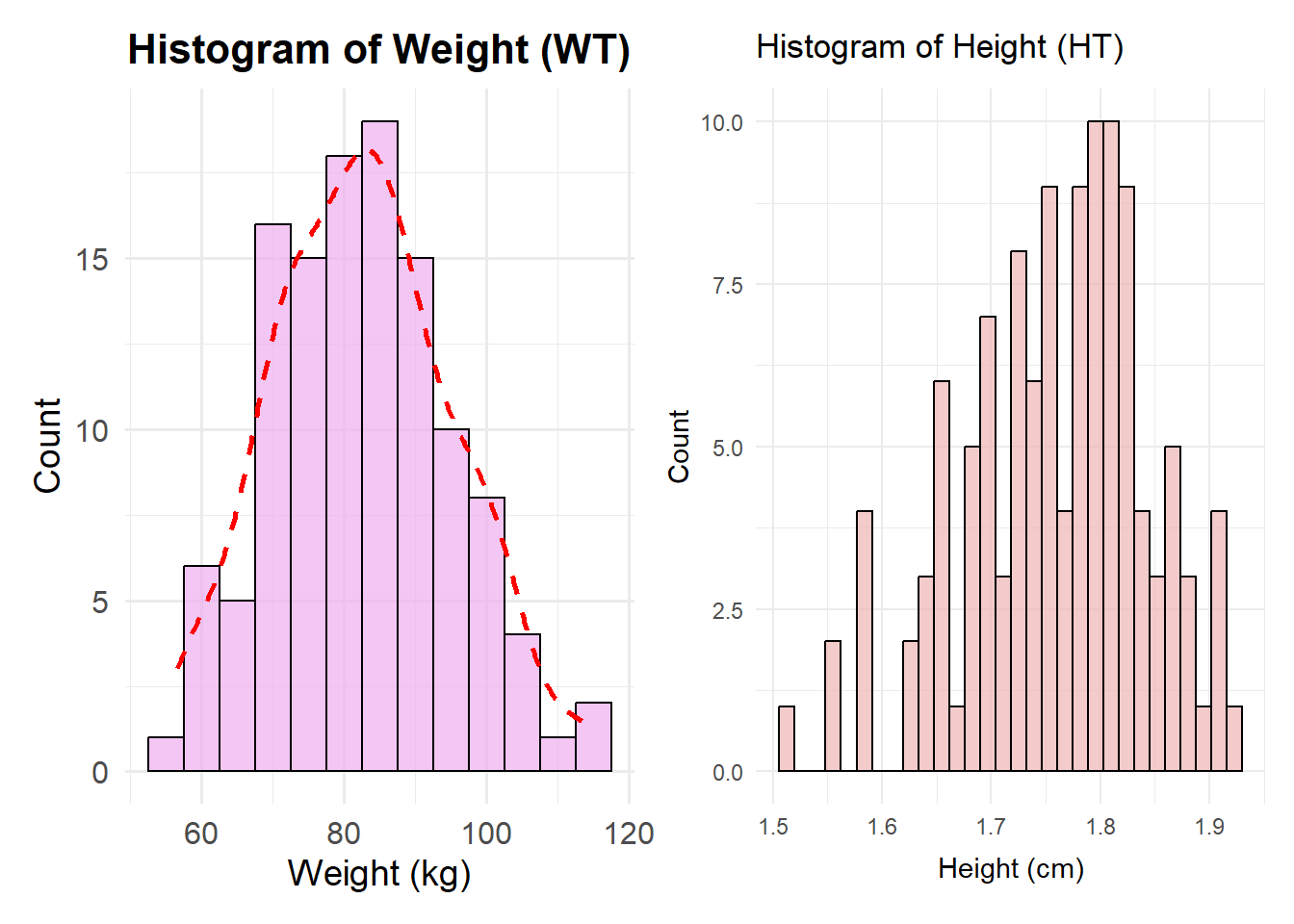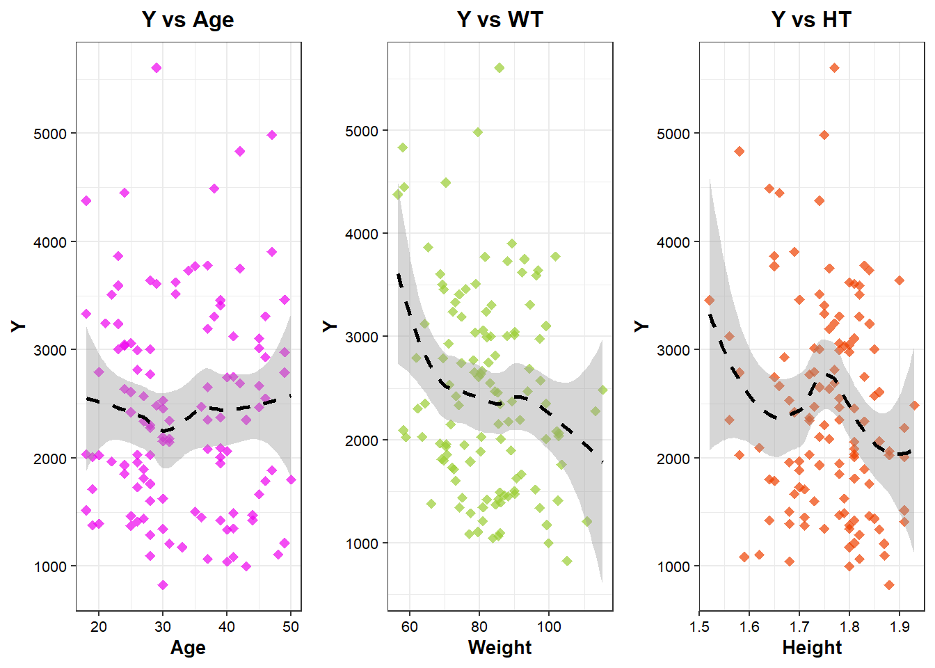 # Scatterplot of Y by AGEplot_age <-ggplot(df, aes(x = AGE, y = Y)) +geom_point(alpha =0.7, size =2, fill="#EE00EE", color="#EE00EE", stroke=1, shape=18) +# Transparent points for better visibilitygeom_smooth(method ="loess", se =TRUE, color ="black", linetype ="dashed", size =1) +# Regression linelabs(title ="Y vs Age",x ="Age",y ="Y") +theme_bw()+theme(axis.title=element_text(size=10, color="black", face="bold"),axis.text=element_text(size=8, color="black"),plot.title=element_text(size=12, color="black", face="bold", hjust=0.5,))# Scatterplot of Y by WT (Weight)plot_wt <-ggplot(df, aes(x = WT, y = Y)) +geom_point(alpha =0.7, size =2, fill="#9ACD32", color="#9ACD32", stroke=1, shape=18) +# Transparent points for better visibilitygeom_smooth(method ="loess", se =TRUE, color ="black", linetype ="dashed", size =1) +# Regression linelabs(title ="Y vs WT",x ="Weight",y ="Y") +theme_bw()+theme(axis.title=element_text(size=10, color="black", face="bold"),axis.text=element_text(size=8, color="black"),plot.title=element_text(size=12, color="black", face="bold", hjust=0.5))# Scatterplot of Y by HT (Height) with correct color scaleplot_ht<-ggplot(df, aes(x = HT, y = Y)) +geom_point(alpha =0.7, size =2, fill="#EE4000", color="#EE4000", stroke=1, shape=18) +# Transparent points for better visibilitygeom_smooth(method ="loess", se =TRUE, color ="black", linetype ="dashed", size =1) +# Regression linelabs(title ="Y vs HT",x ="Height",y ="Y") +theme_bw()+theme(axis.title=element_text(size=10, color="black", face="bold"),axis.text=element_text(size=8, color="black"),plot.title=element_text(size=12, color="black", face="bold", hjust=0.5))# Combine and output the three scatterplotsggarrange(plot_age, plot_wt, plot_ht, ncol=3, nrow=1, align="h", heights=c(1, 1, 1))
