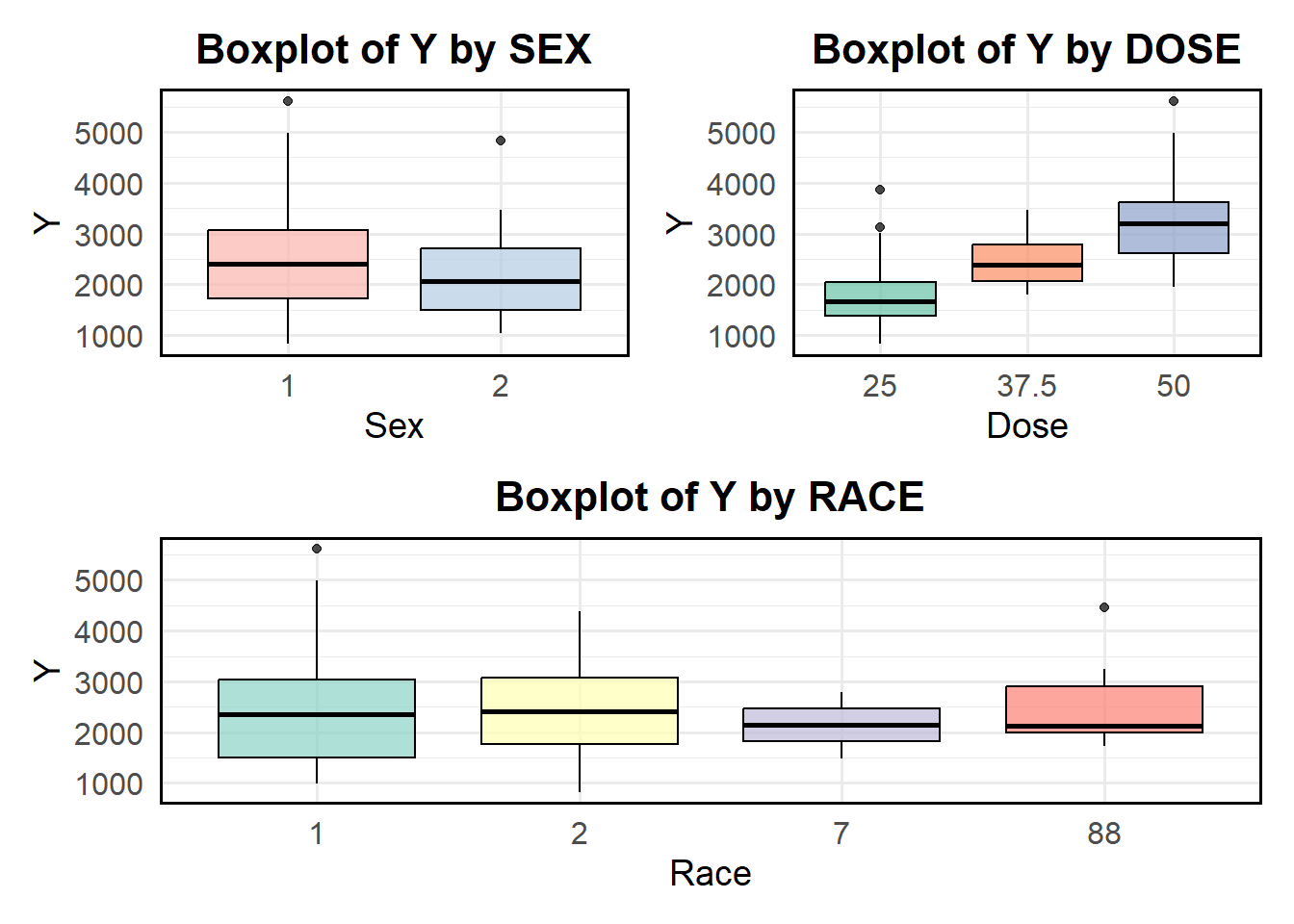 Based on the scatter plot above, race 1 has a wider spread of Y values with more extreme values (outliers). The spread of Y for Sex 1 is slightly larger than for Sex 2. Sex 2 appears to have slightly higher median Y values. The interquartile range (IQR) suggests that the distribution of Y values differs between sexes.The median Y value increases with increasing dose. The spread of Y also increases as the dose increases. The dose group 50 shows the widest variability, with more extreme values.