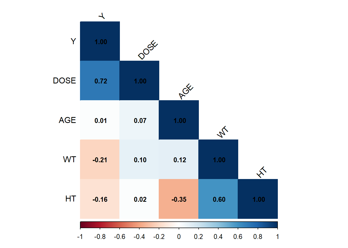 Based on the correlation matrix, DOSE is the strongest predictor of Y, showing a positive correlation (0.72). AGE does not seem to have a meaningful relationship with any variable. Weight (WT) and Height (HT) are moderately correlated (0.60), which makes sense biologically. There are weak negative correlations of Y with WT and HT, but their impact is likely small.