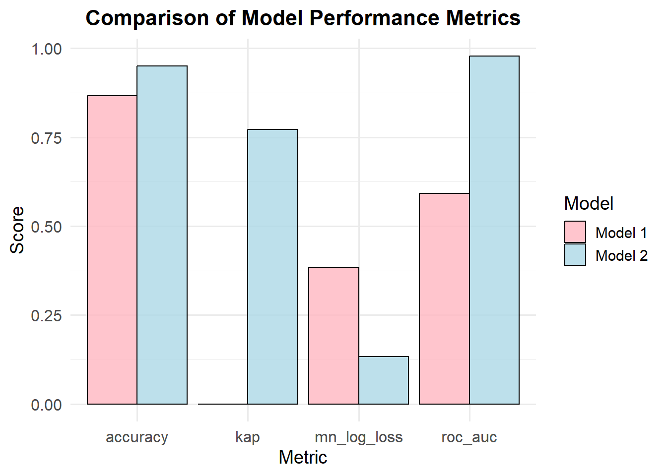 # Create a data frame for both modelsmetrics_df <-data.frame(metric =rep(c("accuracy", "kap", "mn_log_loss", "roc_auc"), 2), # Repeating metricsestimate =c(0.8667, 0.0000, 0.3843, 0.5919, # First model0.9500, 0.7716, 0.1334, 0.9784), # Second modelmodel =rep(c("Model 1", "Model 2"), each =4) # Model labels)# Create a grouped bar plotggplot(metrics_df, aes(x = metric, y = estimate, fill = model)) +geom_bar(stat ="identity", position ="dodge", color ="black", alpha =0.8) +# Grouped barslabs(title ="Comparison of Model Performance Metrics",x ="Metric",y ="Score",fill ="Model") +theme_minimal(base_size =14) +# Clean themescale_fill_manual(values =c("Model 1"="lightpink", "Model 2"="lightblue")) +# Custom colorstheme(plot.title =element_text(hjust =0.5, face ="bold", size =16),axis.title =element_text(size =14),axis.text =element_text(size =12) )