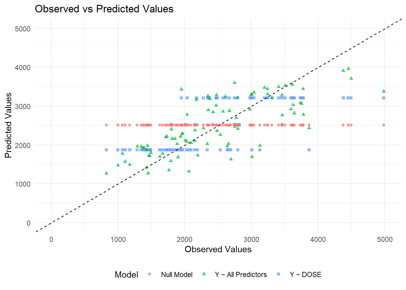 # Generate predictions and combine with observed valuespredictions_dose <-predict(m1_10, train_data) %>%mutate(Model ="Y ~ DOSE") %>%bind_cols(train_data %>%select(Y))predictions_all <-predict(m2_10, train_data) %>%mutate(Model ="Y ~ All Predictors") %>%bind_cols(train_data %>%select(Y))predictions_null <-predict(m3_10, train_data) %>%mutate(Model ="Null Model") %>%bind_cols(train_data %>%select(Y))# Combine all predictions into one dataframepredictions_df <-bind_rows(predictions_dose, predictions_all, predictions_null) %>%rename(Observed = Y, Predicted = .pred)# Create the scatter plotggplot(predictions_df, aes(x = Observed, y = Predicted, color = Model, shape = Model)) +geom_point(alpha =0.7) +geom_abline(slope =1, intercept =0, linetype ="dashed", color ="black") +# 45-degree linescale_x_continuous(limits =c(0, 5000)) +scale_y_continuous(limits =c(0, 5000)) +labs(title ="Observed vs Predicted Values",x ="Observed Values",y ="Predicted Values") +theme_minimal() +theme(legend.position ="bottom")