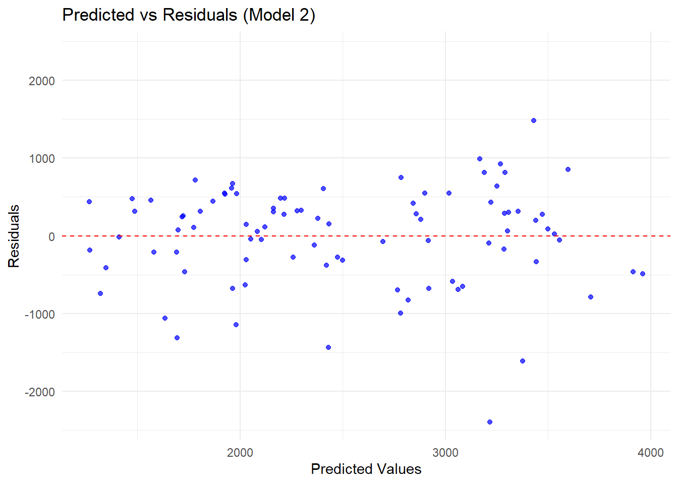 # Compute residuals for Model 2residuals_df <-predict(m2_10, train_data) %>%bind_cols(train_data %>%select(Y)) %>%mutate(Residuals = .pred - Y, Predicted = .pred)# Find the max absolute residual for symmetric y-axis limitsresidual_limit <-max(abs(residuals_df$Residuals))# Load ggplot2 for visualizationlibrary(ggplot2)# Create residuals plotggplot(residuals_df, aes(x = Predicted, y = Residuals)) +geom_point(alpha =0.7, color ="blue") +# Scatter plot of residualsgeom_hline(yintercept =0, linetype ="dashed", color ="red") +# Reference line at 0scale_y_continuous(limits =c(-residual_limit, residual_limit)) +# Symmetric y-axislabs(title ="Predicted vs Residuals (Model 2)",x ="Predicted Values",y ="Residuals") +theme_minimal()