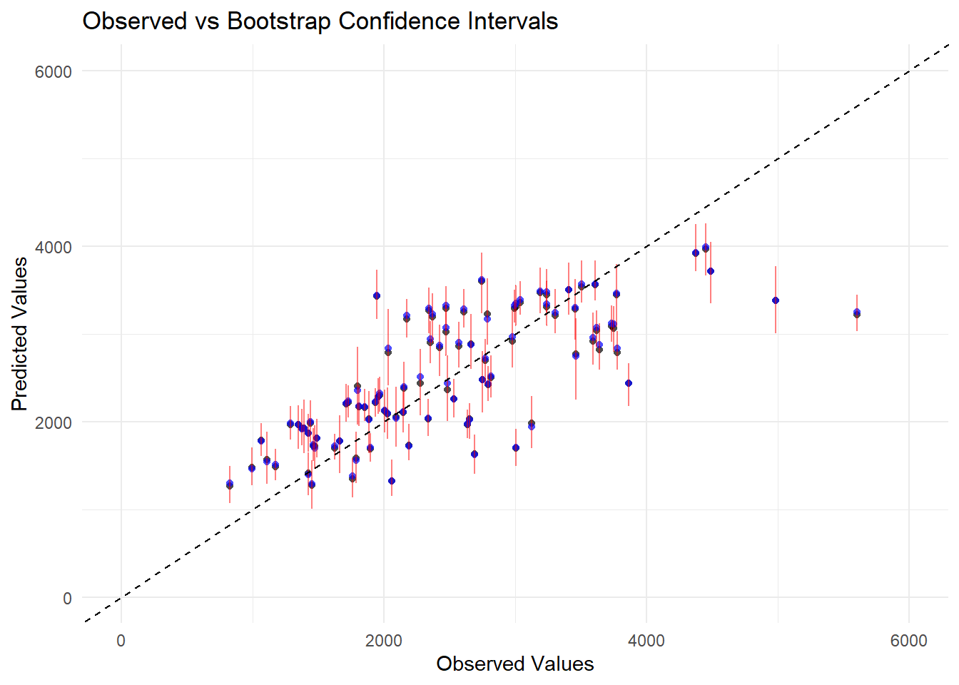 #set seedset.seed(rngseed)# Create 100 bootstrap samplesdat_bs <-bootstraps(train_data, times =100)# Fit the model to each bootstrap sample and store predictionspred_bs <-matrix(NA, nrow =nrow(train_data), ncol =100)for (i in1:100) {# Extract bootstrap sample dat_sample <-analysis(dat_bs$splits[[i]])# Fit model to bootstrap sample m2_bs <-linear_reg() %>%set_engine("lm") %>%fit(Y ~ DOSE + AGE + SEX + WT + HT, data = dat_sample)# Make predictions for original training data pred_bs[, i] <-predict(m2_bs, train_data)$.pred}# Compute mean and confidence intervals for predictionspreds <-apply(pred_bs, 1, quantile, probs =c(0.055, 0.5, 0.945)) |>t()colnames(preds) <-c("Lower", "Median", "Upper")# Compute point estimate from the original modelpoint_estimate <-predict(m2_10, train_data)$.pred# Create dataframe with observed values, point estimates, and bootstrap statisticsplot_data <- train_data %>%mutate(Point_Estimate = point_estimate,Median = preds[, "Median"],Lower = preds[, "Lower"],Upper = preds[, "Upper"])# Load ggplot2 for visualizationlibrary(ggplot2)# Create the plotggplot(plot_data, aes(x = Y)) +geom_point(aes(y = Point_Estimate), color ="black", shape =16, alpha =0.7) +# Point estimatesgeom_point(aes(y = Median), color ="blue", shape =16, alpha =0.7) +# Bootstrap mediangeom_errorbar(aes(ymin = Lower, ymax = Upper), color ="red", width =0.2, alpha =0.5) +# Confidence intervalsgeom_abline(slope =1, intercept =0, linetype ="dashed", color ="black") +# 45-degree linescale_x_continuous(limits =c(0, 6000)) +scale_y_continuous(limits =c(0, 6000)) +labs(title ="Observed vs Bootstrap Confidence Intervals",x ="Observed Values",y ="Predicted Values") +theme_minimal() +theme(legend.position ="bottom")