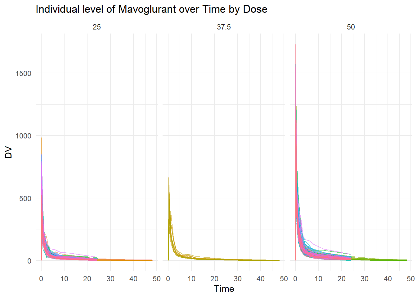 # Spaghetti plotspaghetti_pot <-ggplot(data, aes(x = TIME, y = DV, group = ID, color =as.factor(ID))) +geom_line(alpha =0.6) +# Adds individual lines with transparencyfacet_wrap(~DOSE)+# to facet by dosetheme_minimal() +# Uses a clean themelabs(title ="Individual level of Mavoglurant over Time by Dose",x ="Time",y ="DV",color ="Subject ID") +theme(legend.position ="none") # Hides legend if too many IDsprint(spaghetti_pot)