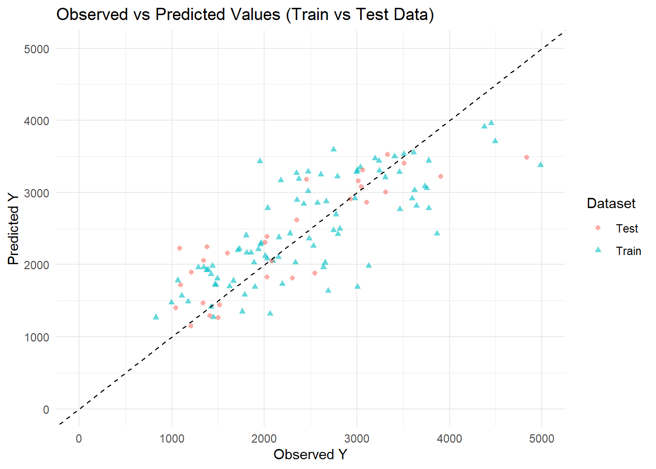 ggplot(pred_combined , aes(x = Y, y = .pred, color = Dataset, shape = Dataset)) +geom_point(alpha =0.6) +# Scatter points for observed vs predictedgeom_abline(slope =1, intercept =0, linetype ="dashed", color ="black") +# Reference 45-degree linescale_x_continuous(limits =c(0, 5000)) +# Set x-axis rangescale_y_continuous(limits =c(0, 5000)) +# Set y-axis rangelabs(title ="Observed vs Predicted Values (Train vs Test Data)",x ="Observed Y",y ="Predicted Y",color ="Dataset") +theme_minimal()