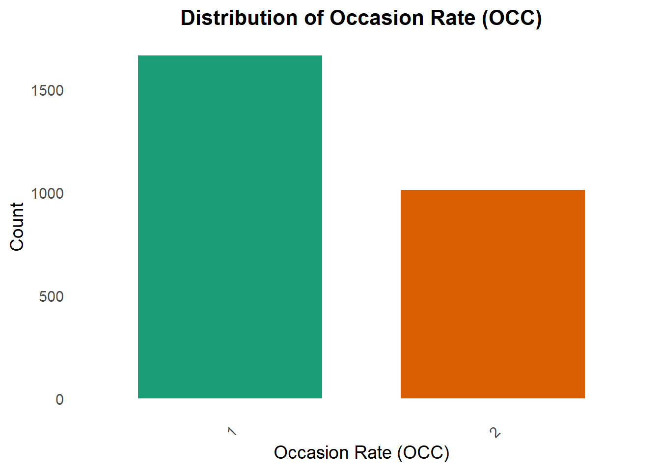 plot_occ <-ggplot(data, aes(x =factor(OCC))) +geom_bar(aes(fill =factor(OCC)), show.legend =FALSE, width =0.7) +# Color bars dynamicallyscale_fill_brewer(palette ="Dark2") +# Use a more vibrant color palettelabs(title ="Distribution of Occasion Rate (OCC)",x ="Occasion Rate (OCC)",y ="Count") +theme_minimal(base_size =14) +# Increase text size for readabilitytheme(plot.title =element_text(face ="bold", size =16, hjust =0.5),axis.text.x =element_text(angle =45, vjust =1, hjust =1), # Rotate X labels for claritypanel.grid.major =element_blank(), # Remove major grid lines for a cleaner lookpanel.grid.minor =element_blank() )print(plot_occ)