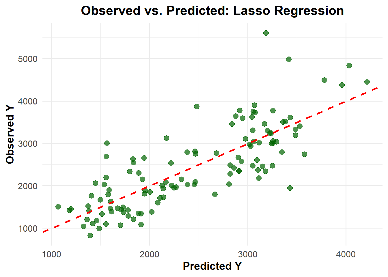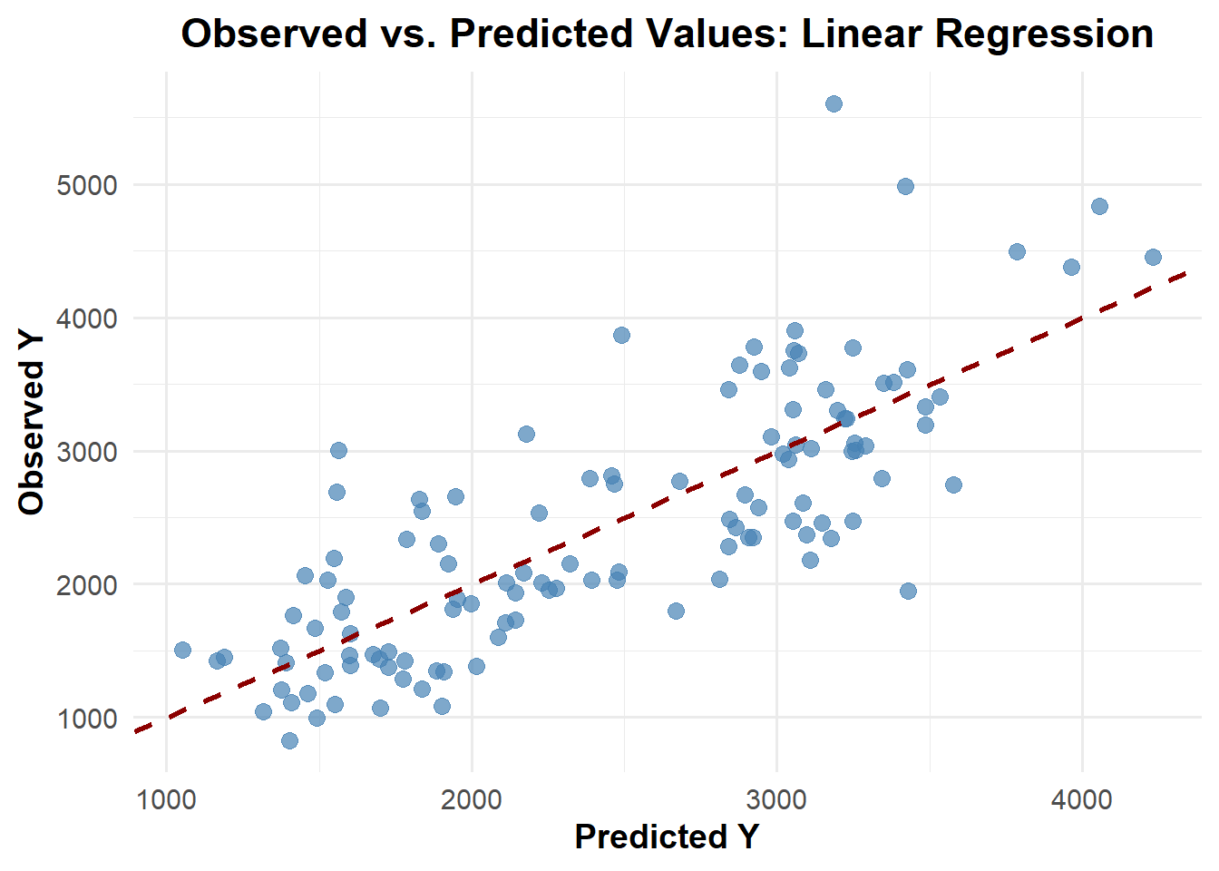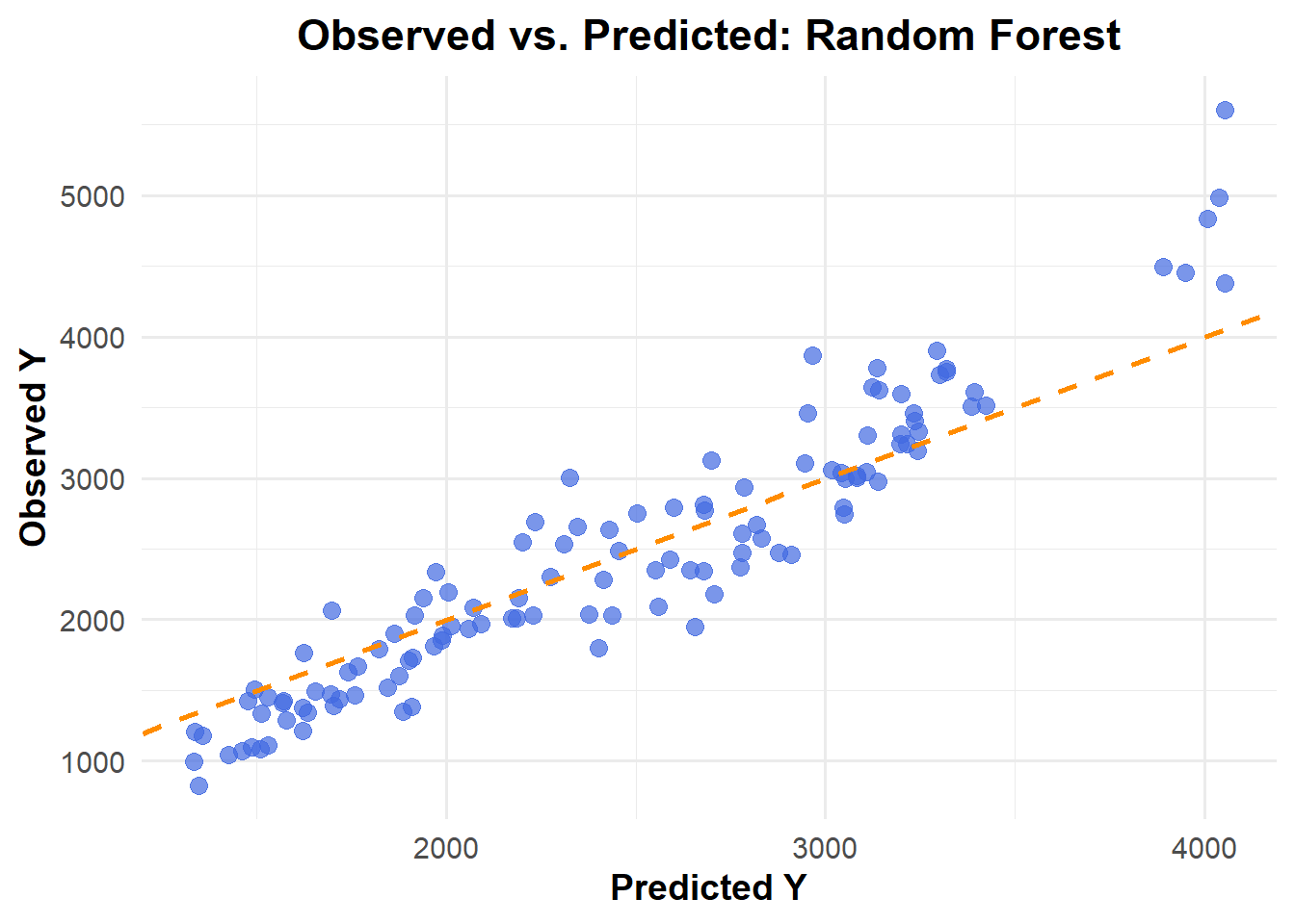 ggplot(pred_m3_rf1, aes(x = .pred, y = Y)) +geom_point(color ="royalblue", alpha =0.7, size =3) +# Data pointsgeom_abline(slope =1, intercept =0, color ="darkorange", linetype ="dashed", size =1) +# Reference linelabs(title ="Observed vs. Predicted: Random Forest",x ="Predicted Y",y ="Observed Y" ) +theme_minimal(base_size =14) +theme(plot.title =element_text(face ="bold", hjust =0.5),axis.title =element_text(face ="bold") )
