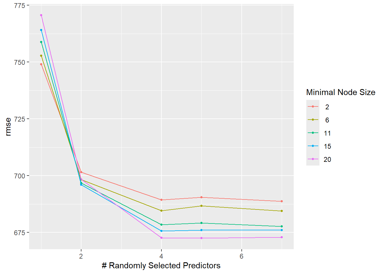 Based on the heatmap of RMSE values from the Random Forest tuning results, the lowest RMSE (i.e., best model performance) is observed in the bottom-right region of the plot — specifically when both mtry is high (5–7) and min_n is small (2–6). This indicates that the model performs best when more predictors are considered at each split (mtry) and the minimum number of samples required to split a node is kept low (min_n). In contrast, model performance worsens (higher RMSE, darker purple) when min_n is large (15–20) and mtry is low (1–2), suggesting that overly simplified trees (due to aggressive pruning or limited variables) reduce predictive accuracy. Thus, tuning should prioritize larger mtry and smaller min_n values for optimal model performance in this case.