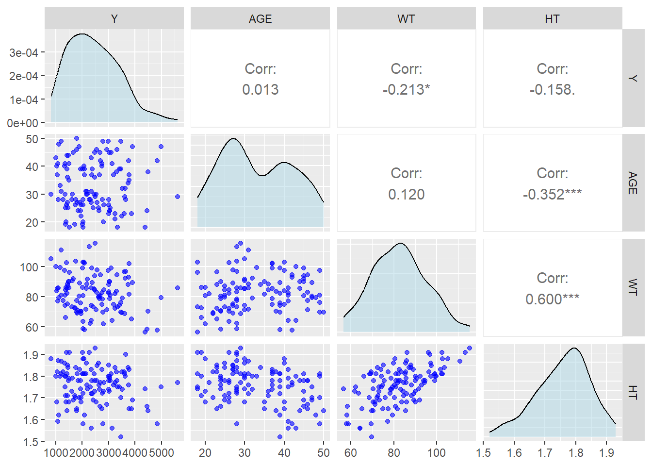 #create data for continous only for Pairwise Pairwise_data <- data_ml %>%select(Y, AGE, WT, HT)#Create Correlation Plot for continus variables Pairwise_data %>%select(Y, AGE, WT, HT) %>%ggpairs(lower =list(continuous =wrap("points", color ="blue", alpha =0.6)),diag =list(continuous =wrap("densityDiag", fill ="lightblue", alpha =0.5)),upper =list(continuous =wrap("cor", size =4)) )